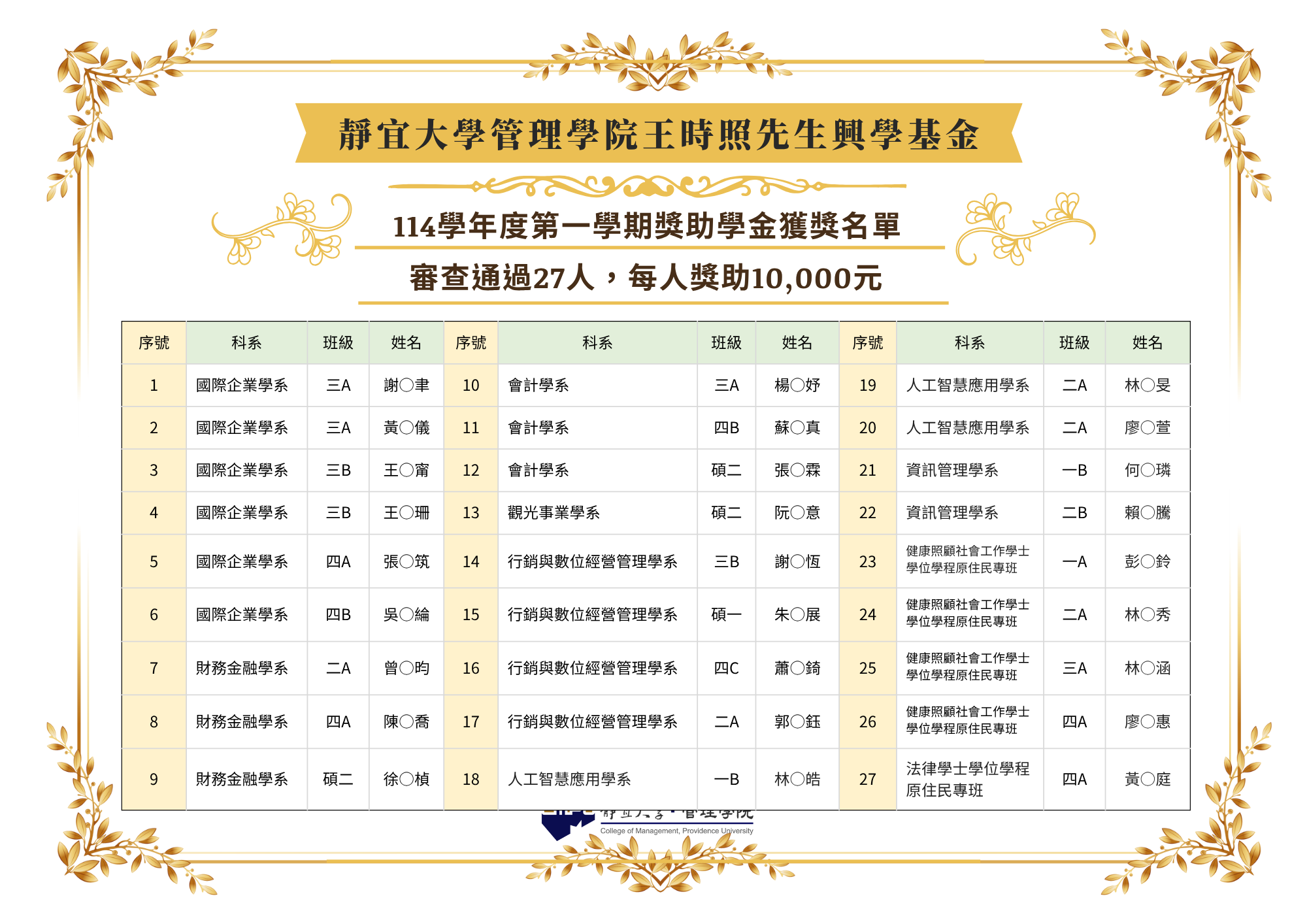 114-1管理學院「王時照先生興學基金」獎助學金獲獎名單